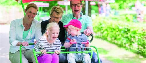 Ready for a great biking adventure with the whole family? Take your seats on the Family Bike: kids sit on the front bench and the adults cycle on the back. Discover every road and little path of the park - the children will show you the way. There's room for two in front, and three at the back.