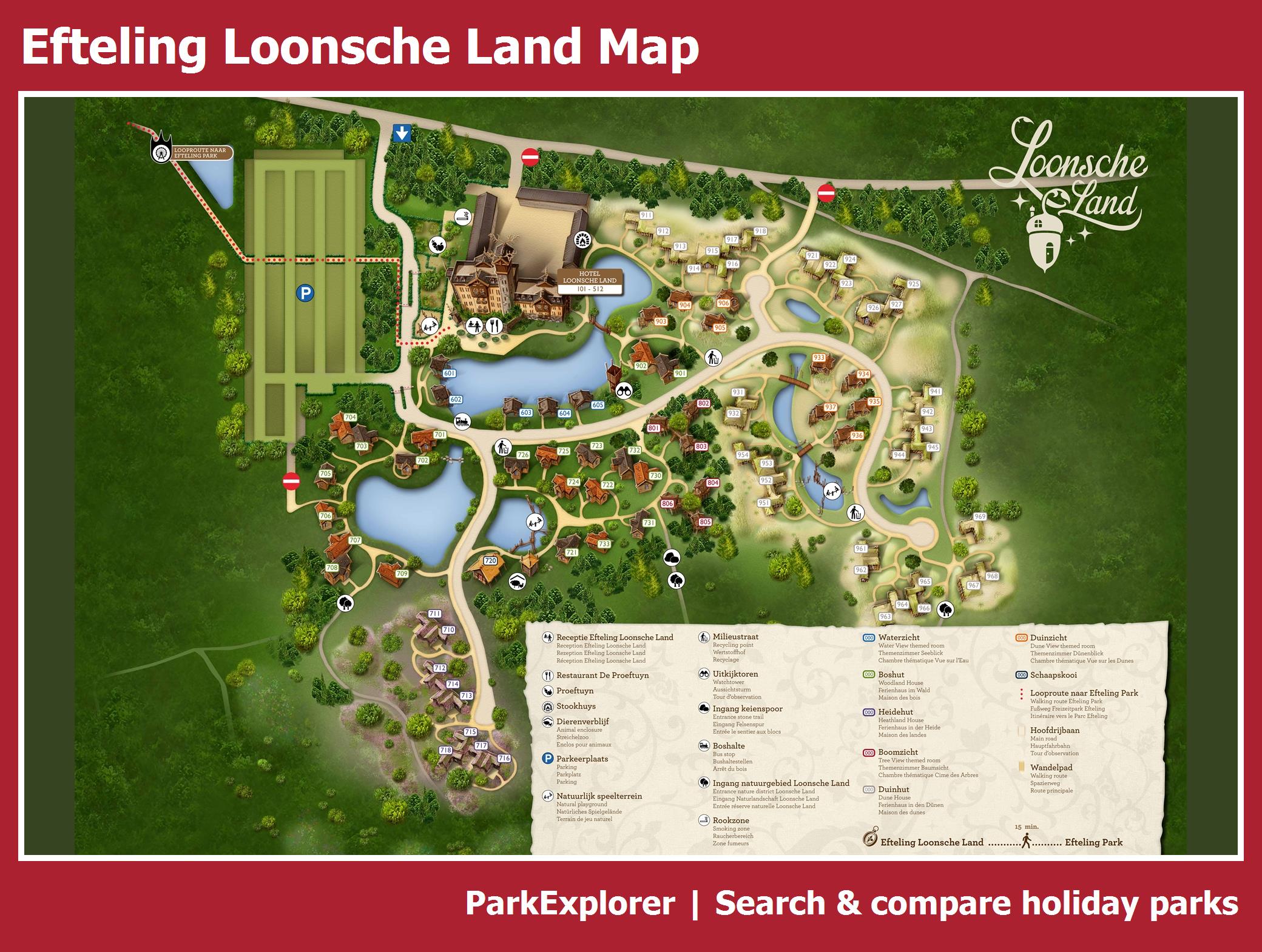 Up-to-date and comprehensive village map of Efteling Loonsche Land with all accommodations and facilities, also available as PDF.