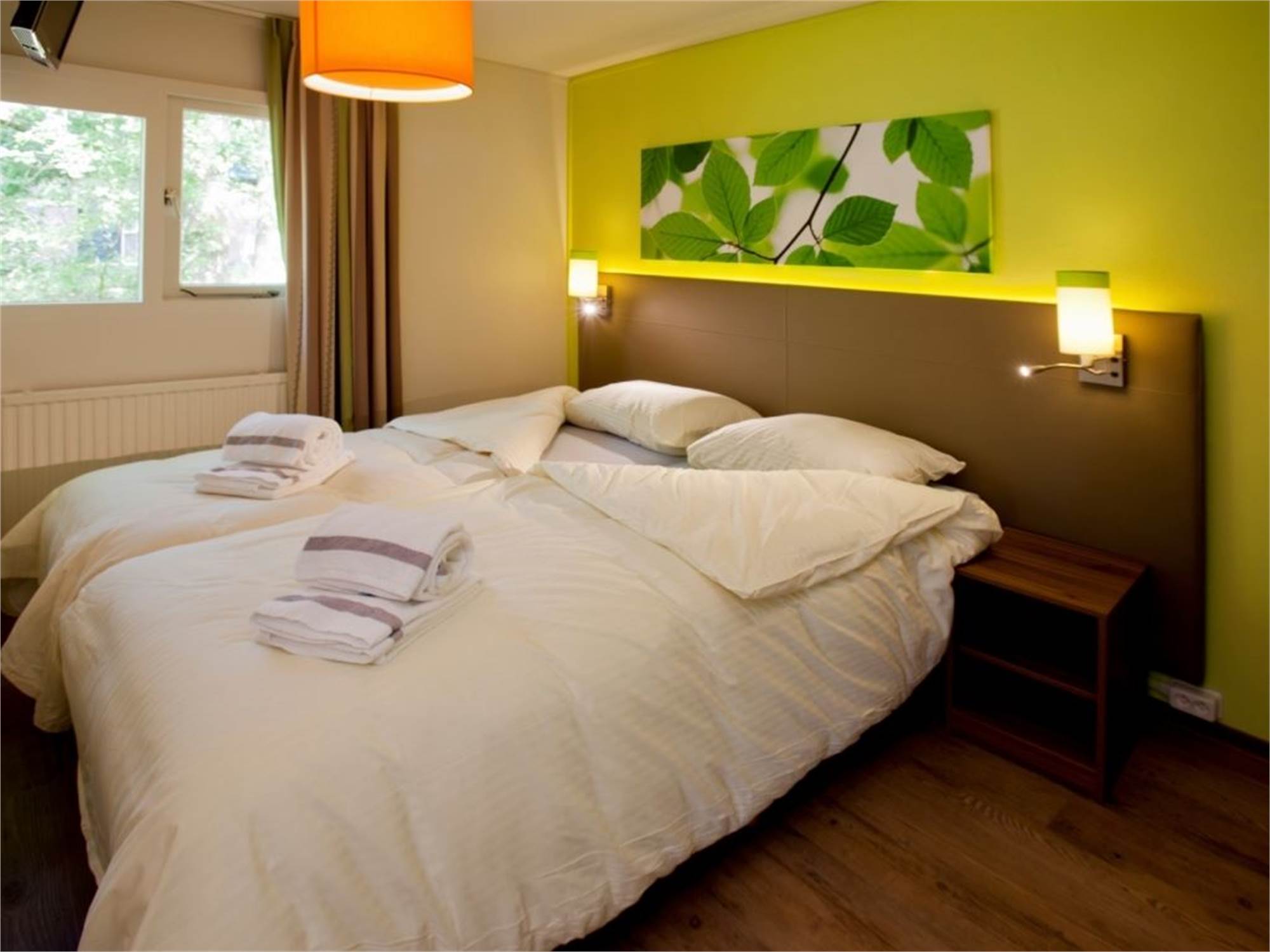 Bedroom with two single Auping box spring beds, 2 person soft mattress topper and flatscreen TV