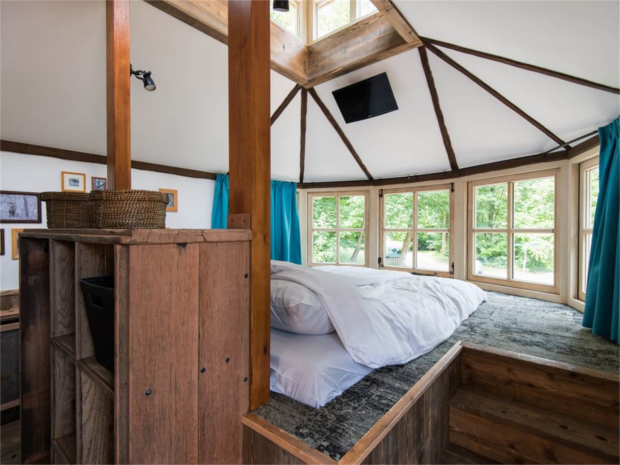 Bedroom with two single box spring beds, 2 person soft mattress topper and flatscreen TV