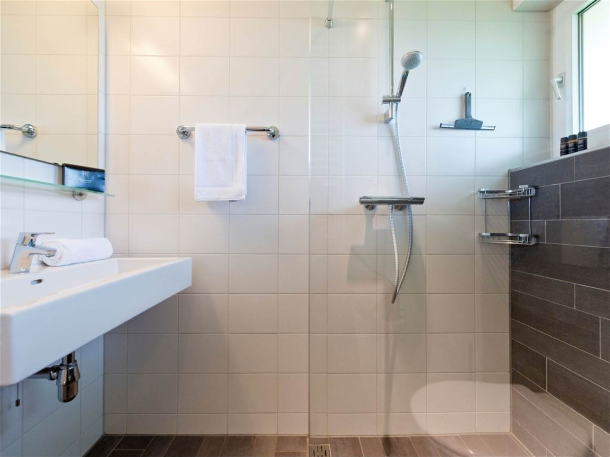 Bathroom with shower cubicle, washbasin and toilet