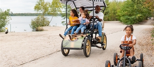 The sidecar is a pedal go-kart type vehicle that allows two people to travel together (1 adult and 1 child, max. 1.55m).