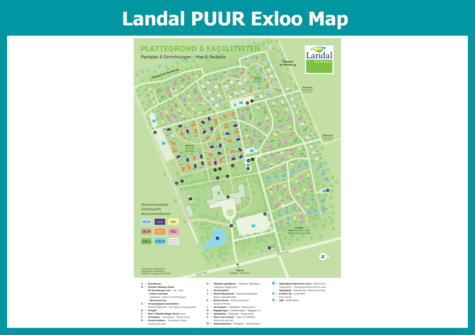 Up-to-date and comprehensive village map of Landal PUUR Exloo with all accommodations and facilities, also available as PDF.