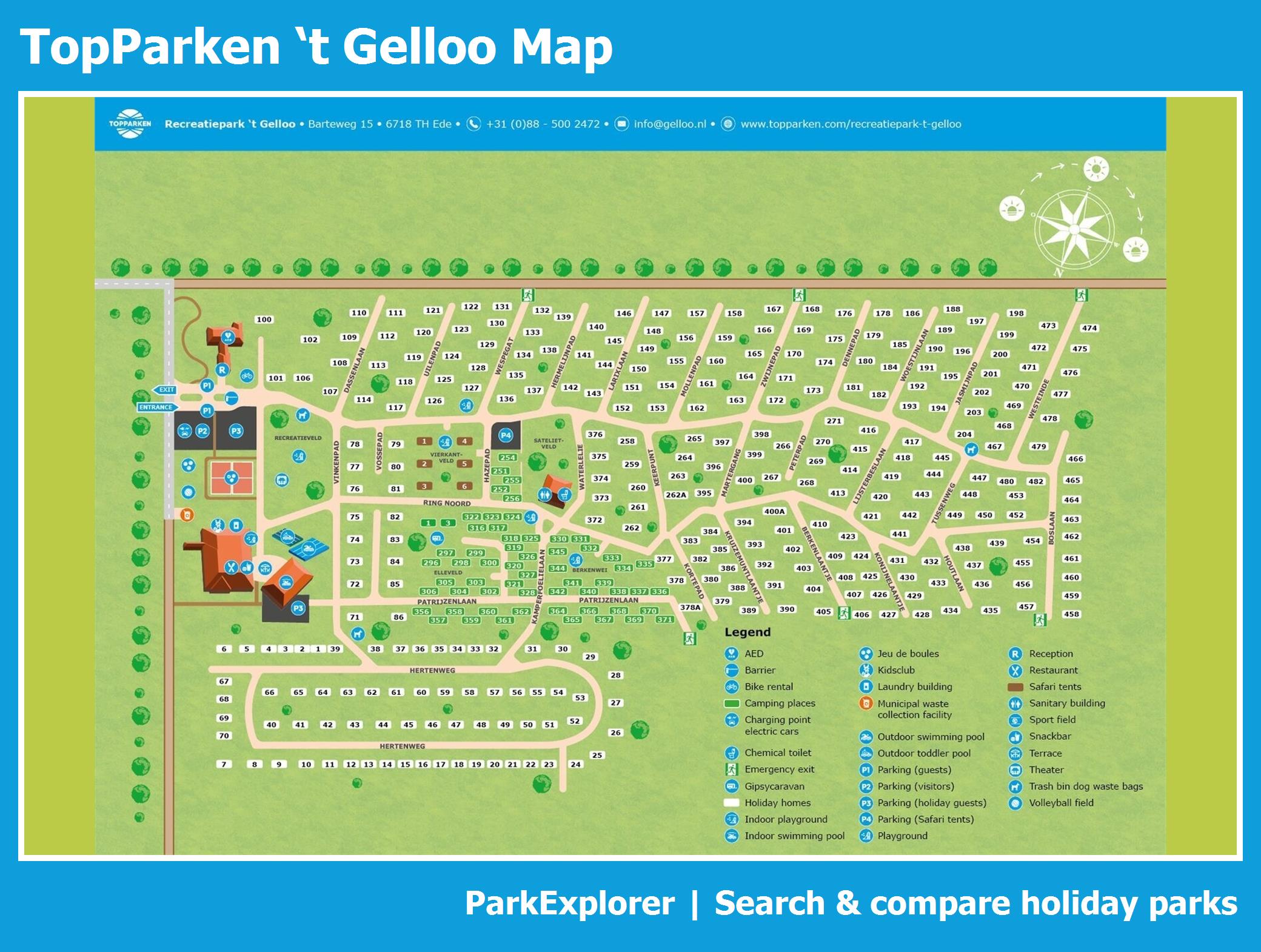 Up-to-date and comprehensive village map of TopParken ‘t Gelloo with all accommodations and facilities, also available as PDF.