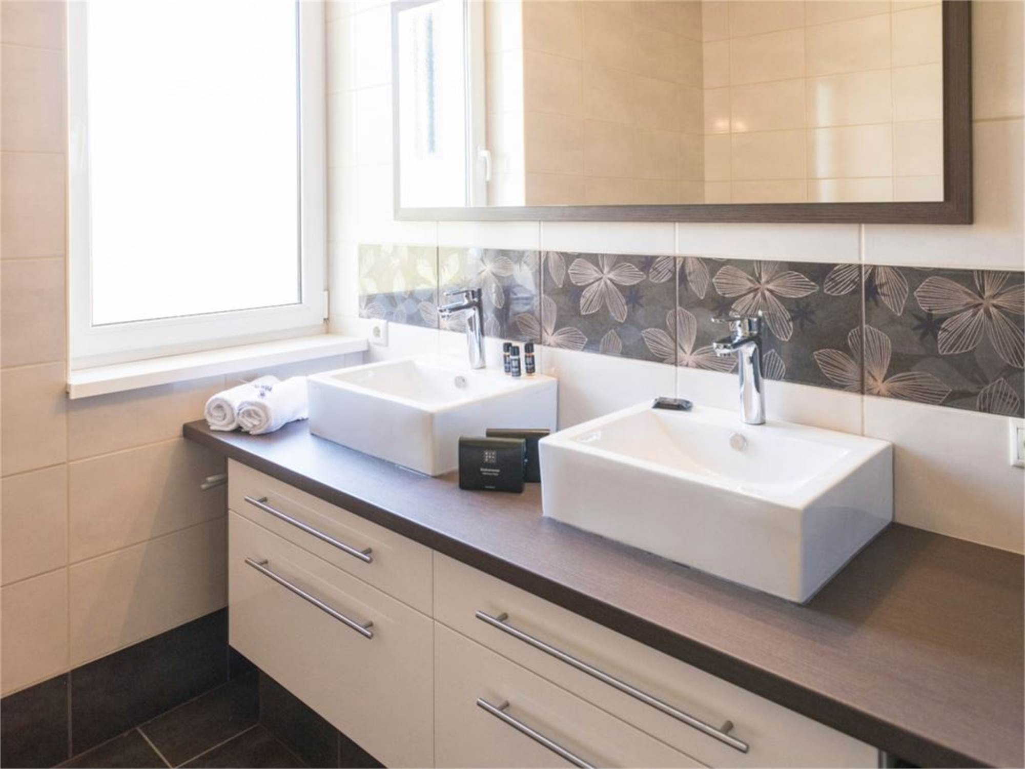 Bathroom with bathtub, sun shower, wasbasin and toilet