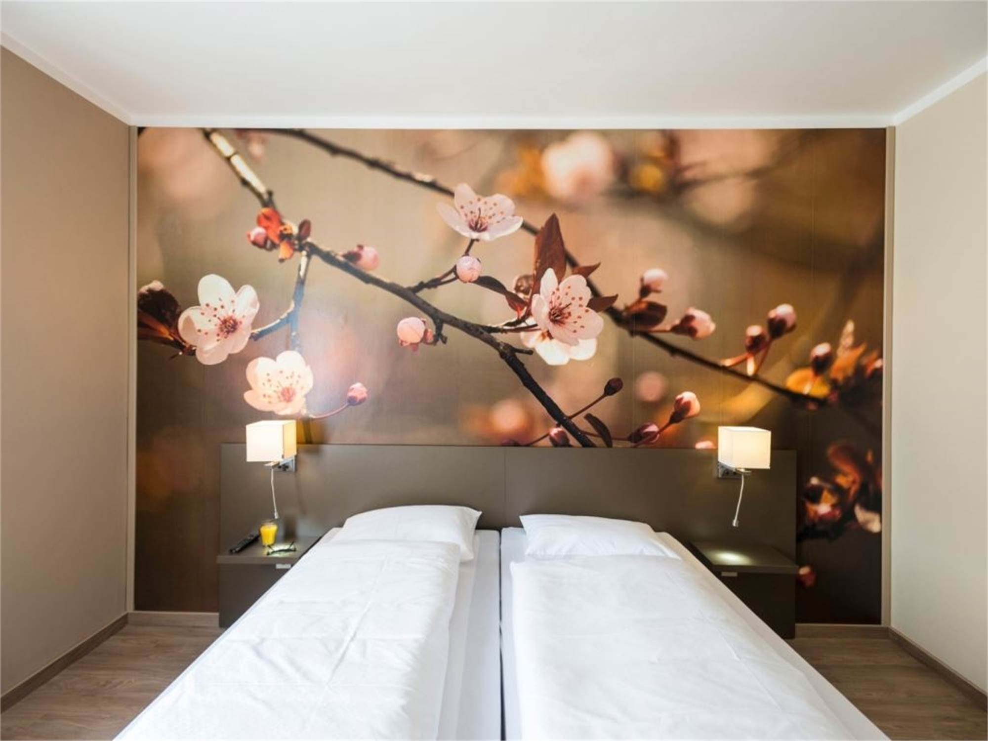 Bedroom with two single box spring beds, soft mattress topper and TV