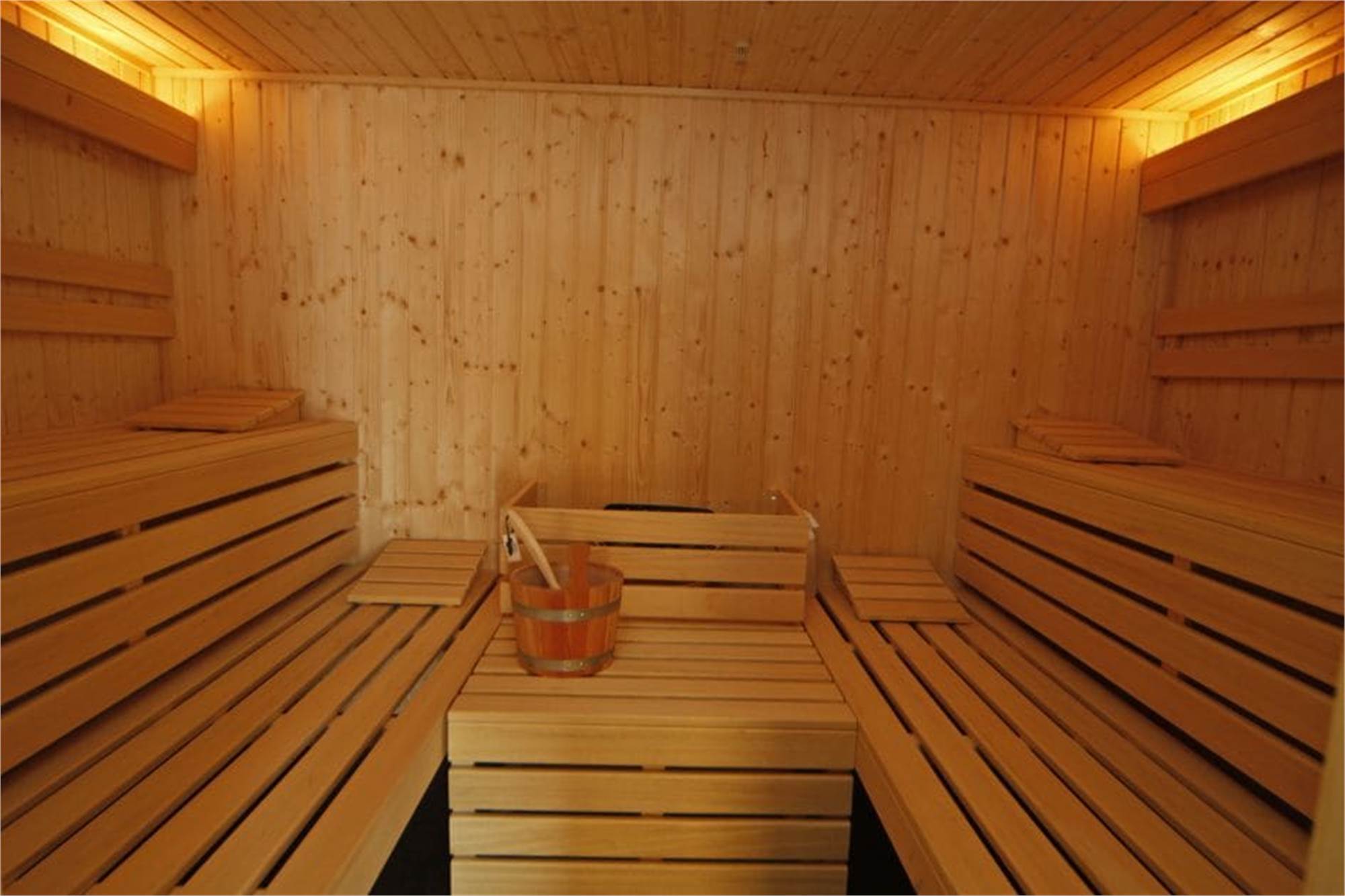 Private sauna garden: attractive enclosed sauna garden that can be locked with wooden building featuring large sauna and relaxation room. Covered outdoor area with garden furniture for 12 persons, outdoor shower and jacuzzi.