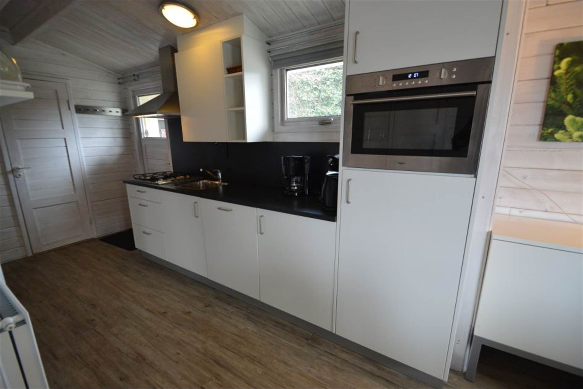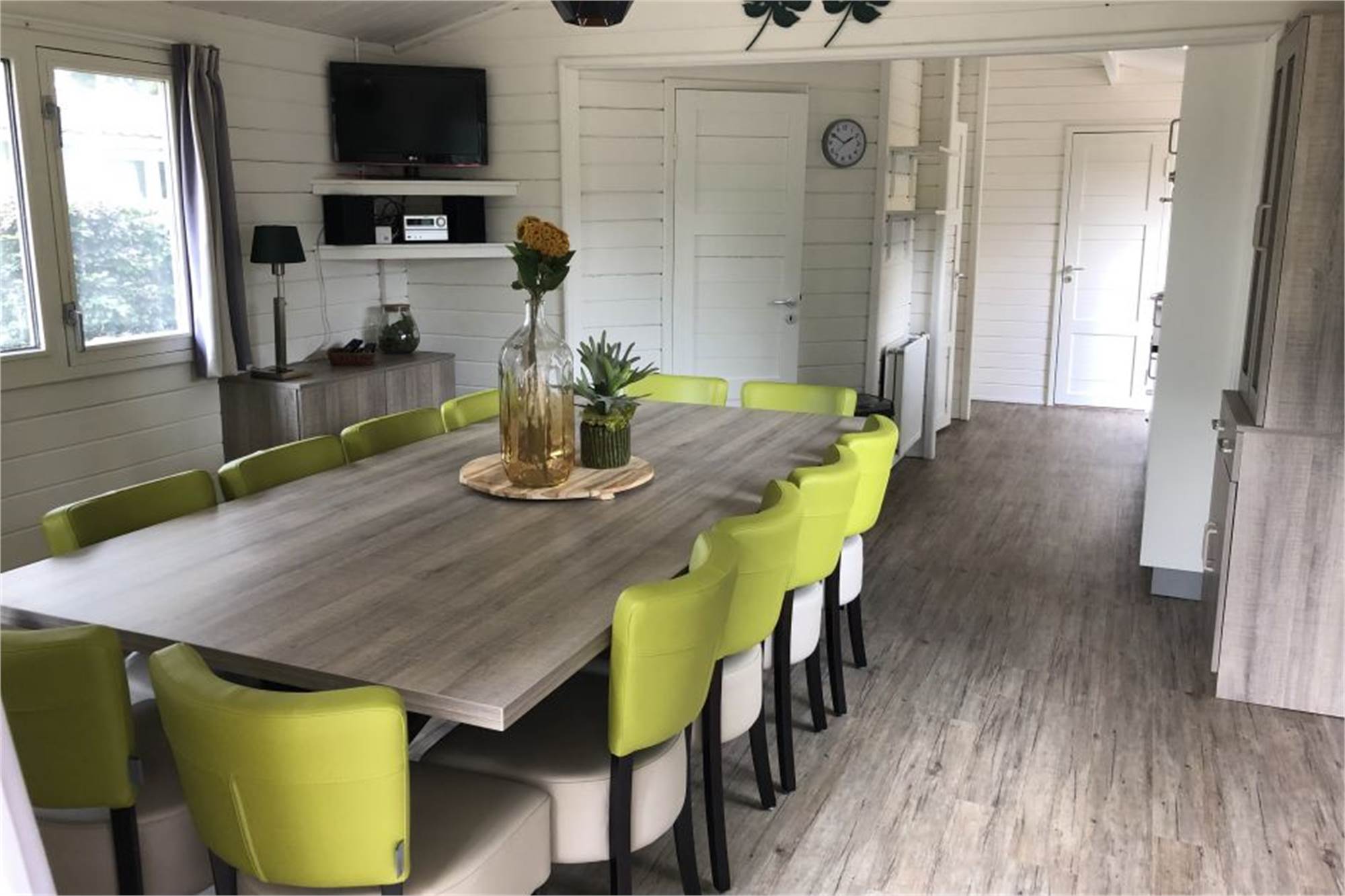 Chalet 2 layout: open-plan kitchen with dishwasher and combination microwave. Spacious living room with a dining area for 12 persons, flatscreen television and DVD player. The bathroom has a shower, washbasin and toilet. Three two-person bedrooms, one of which features a mid sleeper bed. French doors to the terrace.