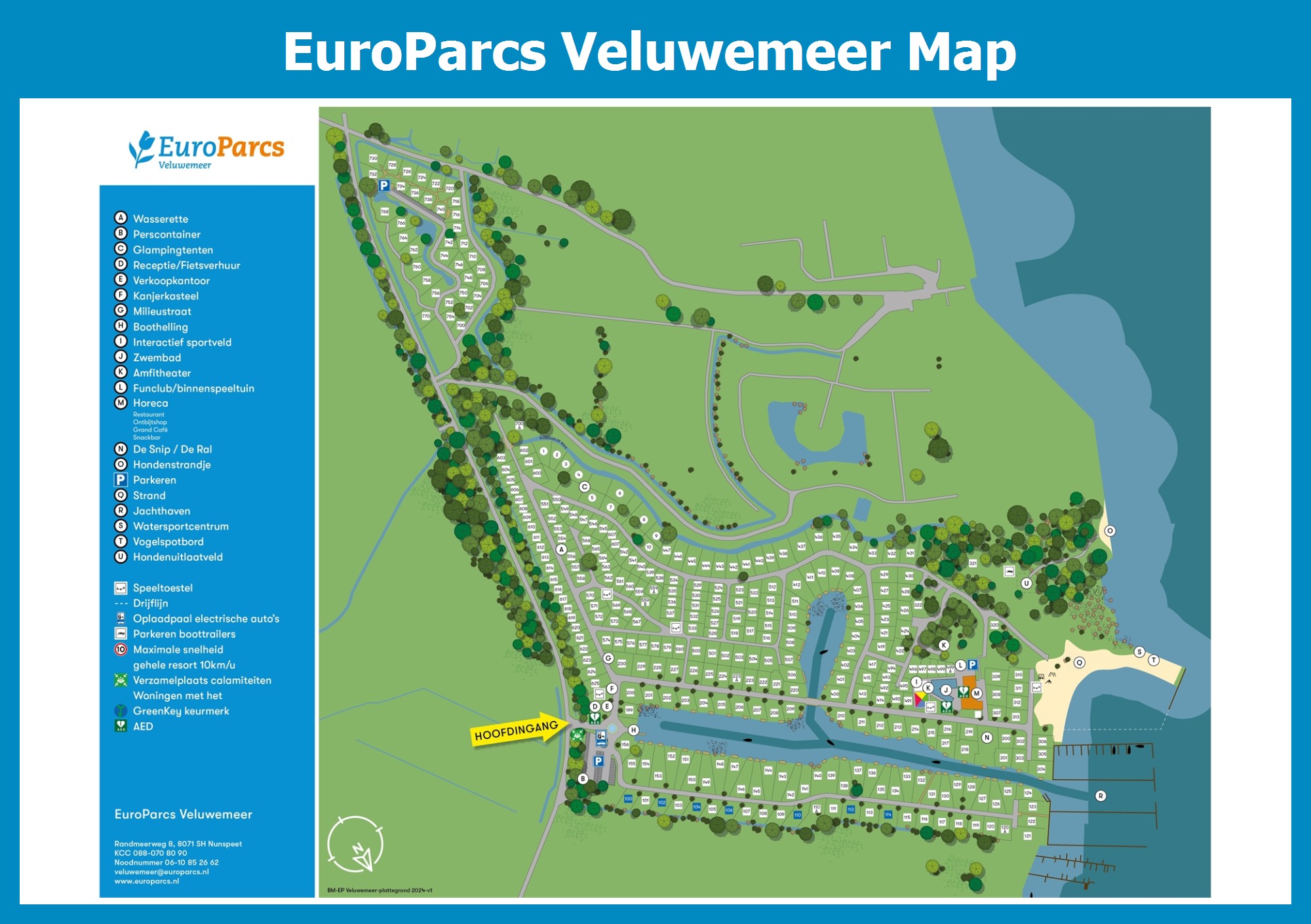 Up-to-date and comprehensive village map of EuroParcs Veluwemeer with all accommodations and facilities, also available as PDF.
