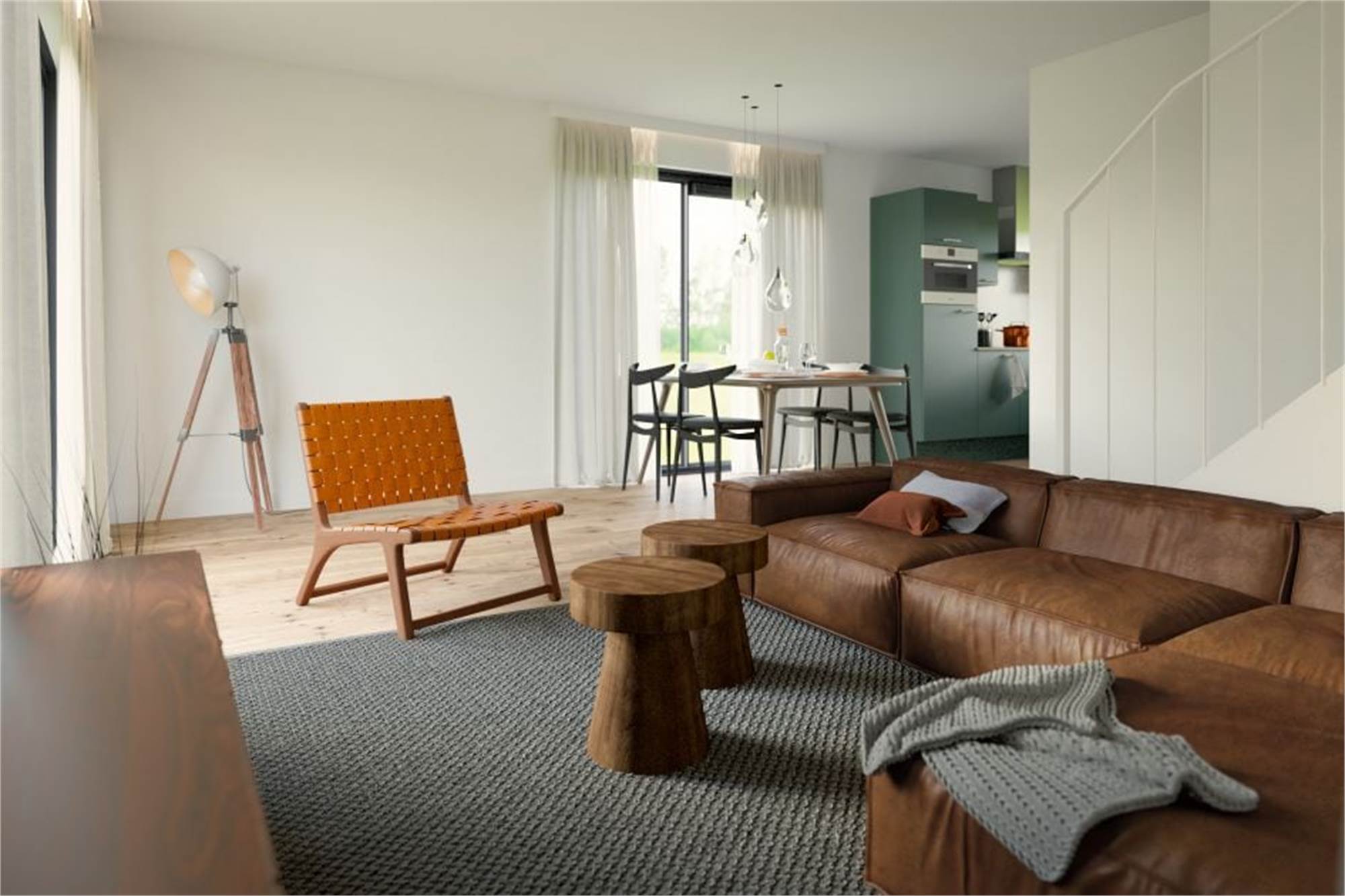 • The living room has a seating area with corner sofa, a TV and dining table with chairs.