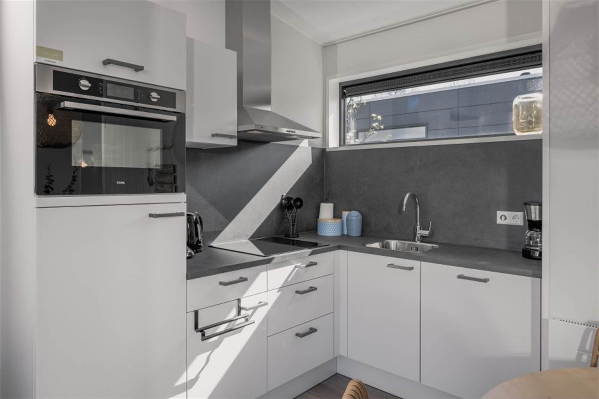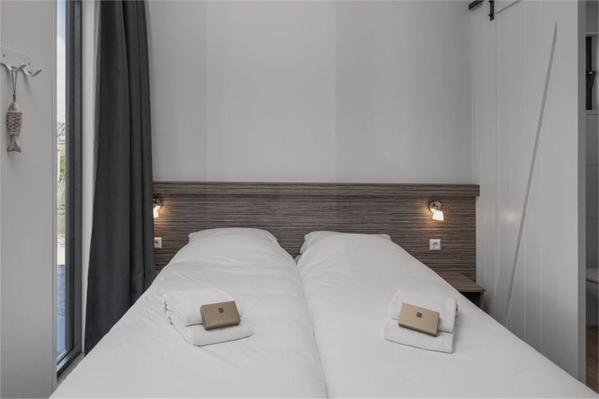 This single-storey detached lodge can accommodate 4 people, and has a large living room with seating area, a smart TV and a dining area. The open-plan kitchen is fully equipped with a coffee pad machine and a kettle, among other things. There are 2 bedrooms, each with 1 en-suite bathroom with a shower. The bedrooms each have 2 single beds, and there is a TV in each bedroom. The bathrooms have a shower and a toilet. The lodge also has a covered terrace that you can access through the french garden doors. You can use the comfortable patio furniture. Parking is possible at the central parking.