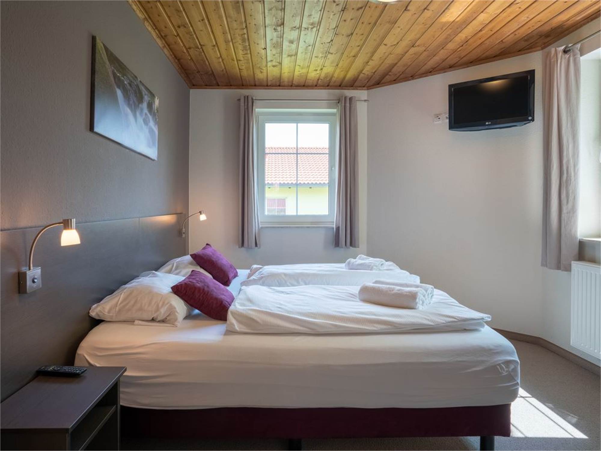 Bedroom with two single box spring beds, 2 person soft mattress topper and flatscreen TV