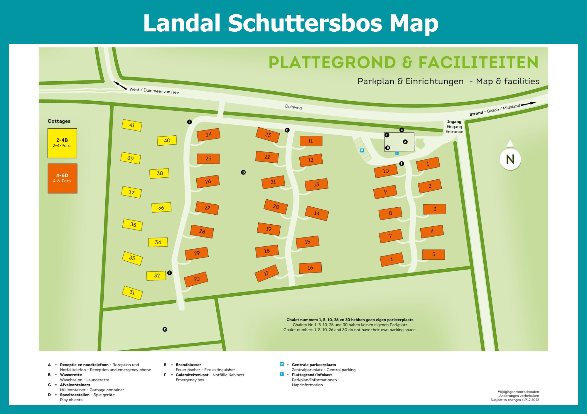 Up-to-date and comprehensive village map of Landal Schuttersbos with all accommodations and facilities, also available as PDF.