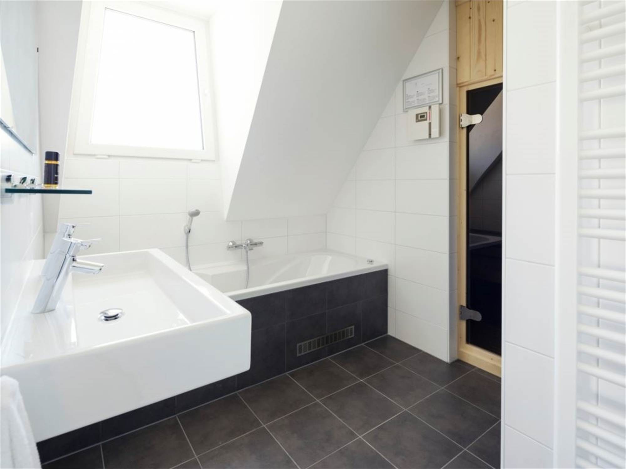 Bathroom with jacuzzi bathtub, shower cubicle and double washbasin on the first floor