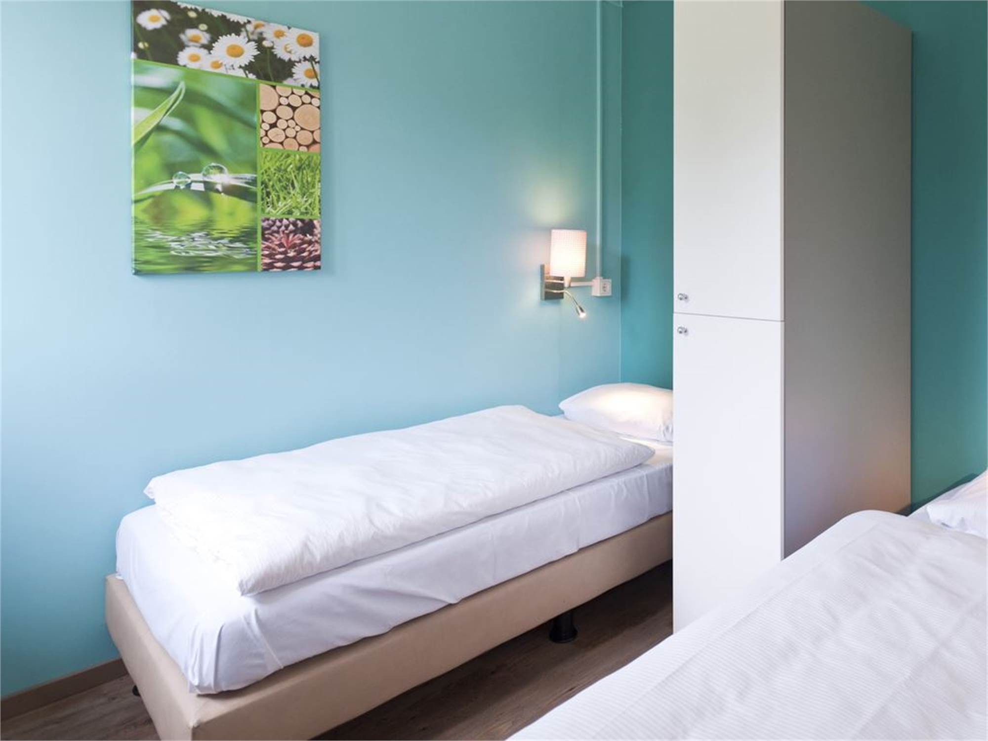 Two bedrooms with two single box spring beds