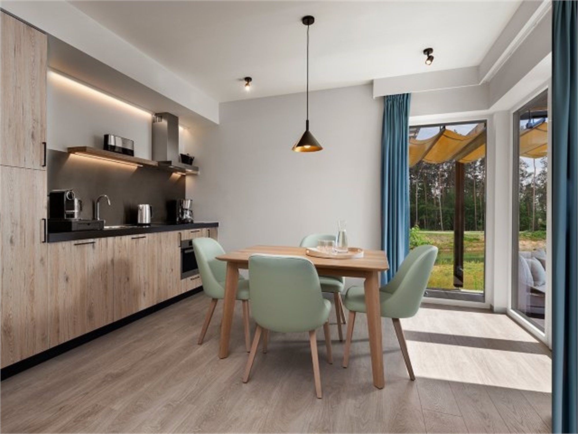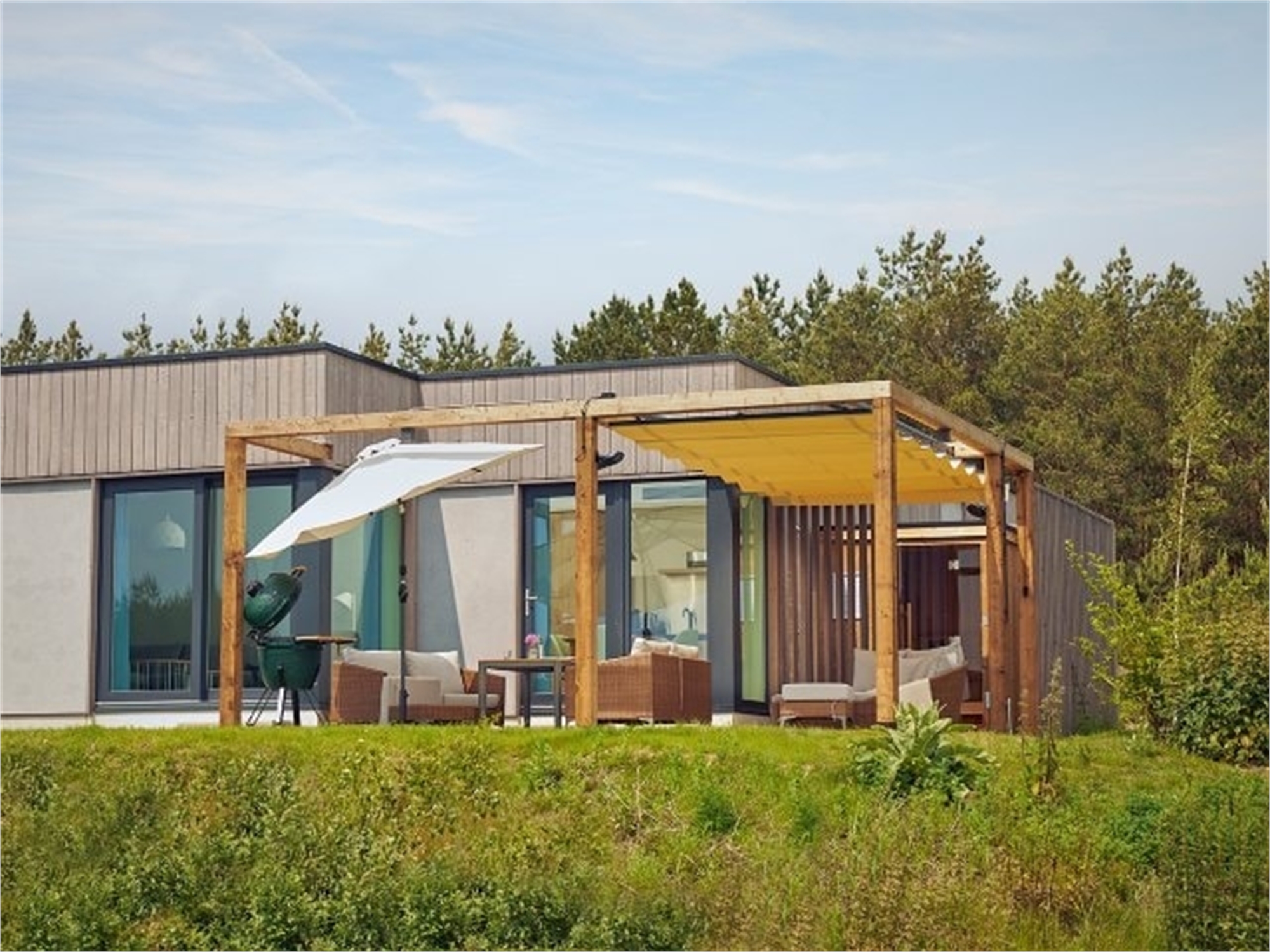 An Exclusive holiday house, enjoying greater comfort with ready-made beds and towels. The holiday houses have a living room with TV, fully equipped kitchen with dishwasher, bathroom with infra-red sauna, bedrooms and a private garden with garden furniture.
