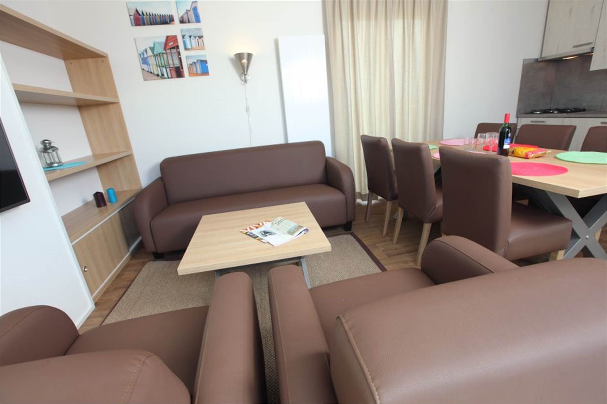 This ground floor, detached lodge is suited for 6 persons. The living room with smart TV has a separate dining corner and the kitchen offers you a dishwasher, microwave oven and coffee pad machine. There are 3 bedrooms; 2 with 2 single box spring beds and 1 bedrooms with a bunk bed. There is also a bathroom with shower. You can make free use of the Wi-Fi and there is parking space for 1 car at the lodge. Some lodges are luxuriously equipped with a washing machine, dryer, television in the bedroom, lounge set and sun beds. These lodges can be booked with preference.