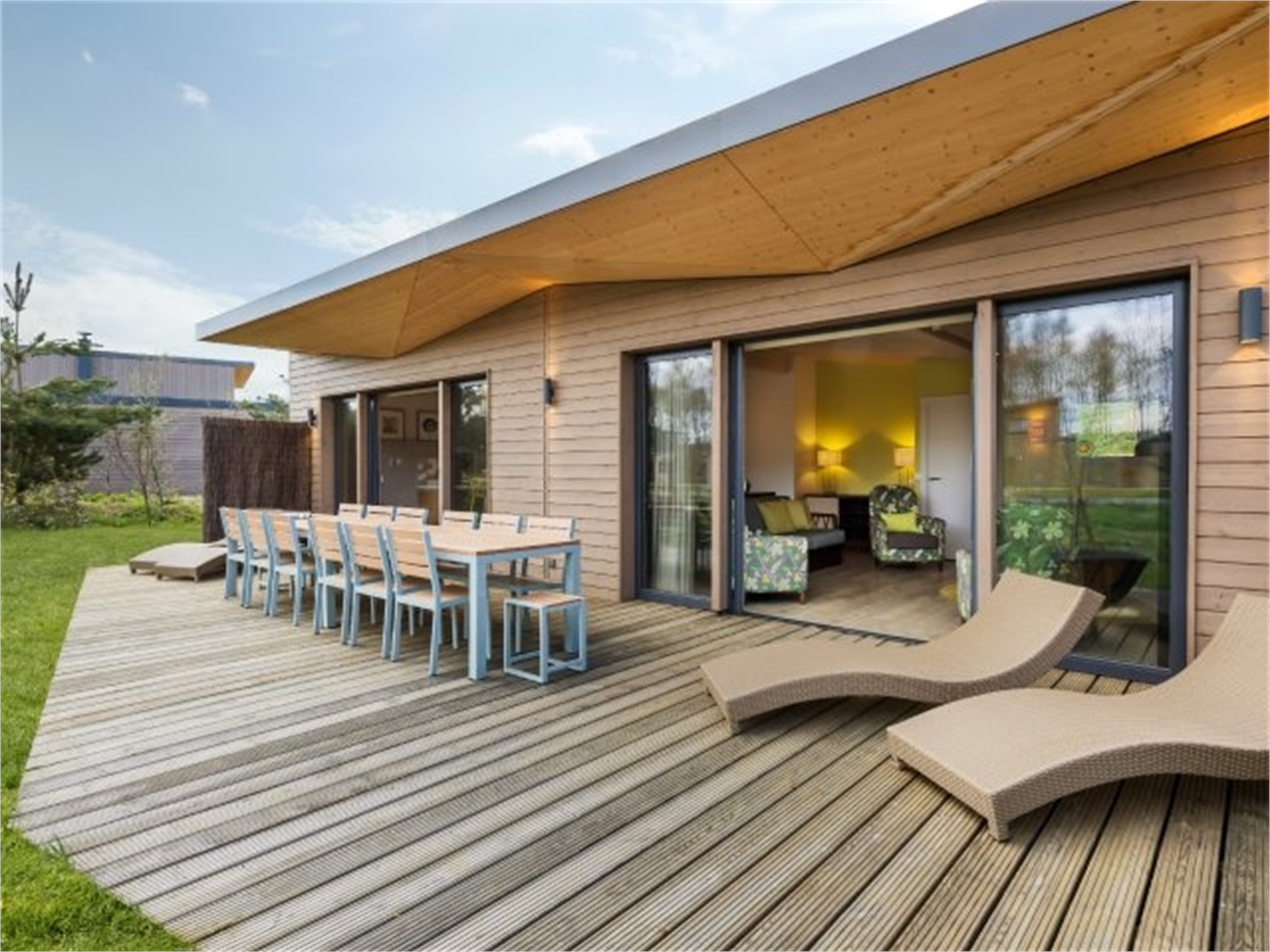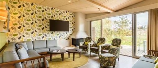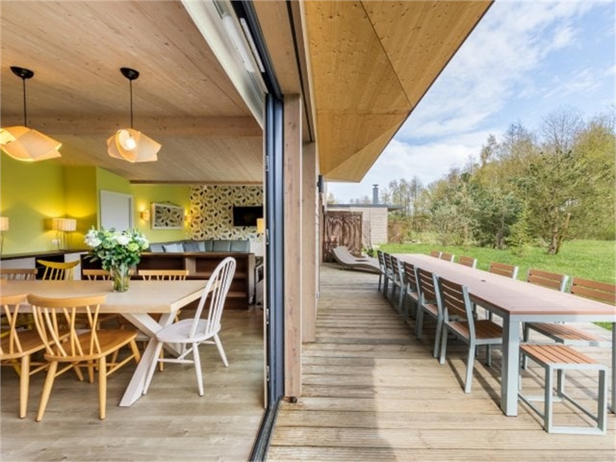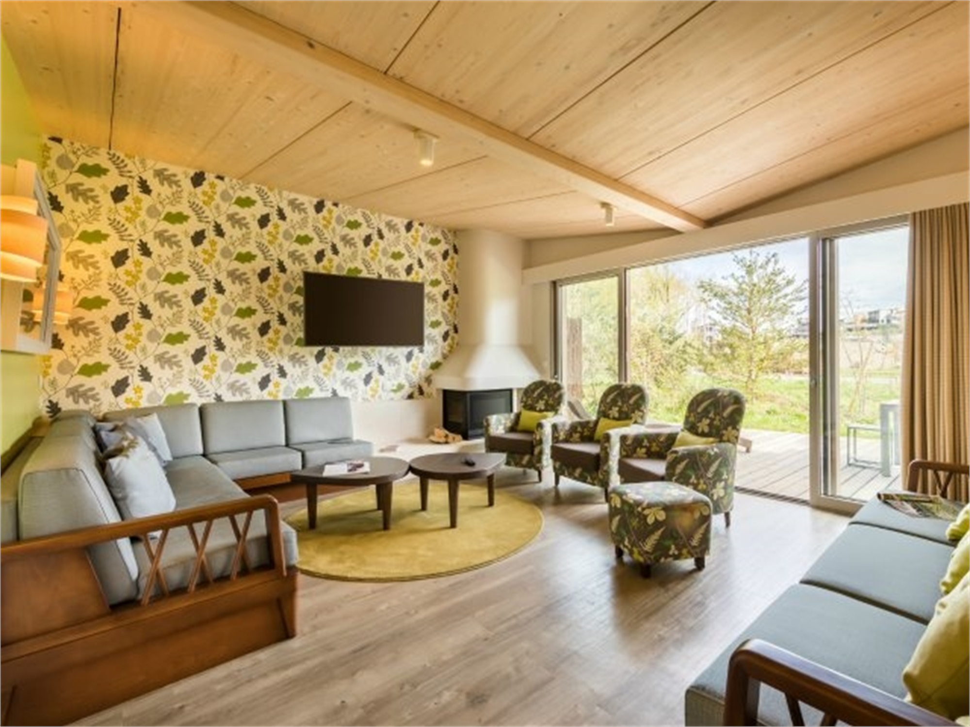 Living room with fireplace, flat-screen television. Large floor-to-ceiling windows look out onto the wooden terrace furnished
