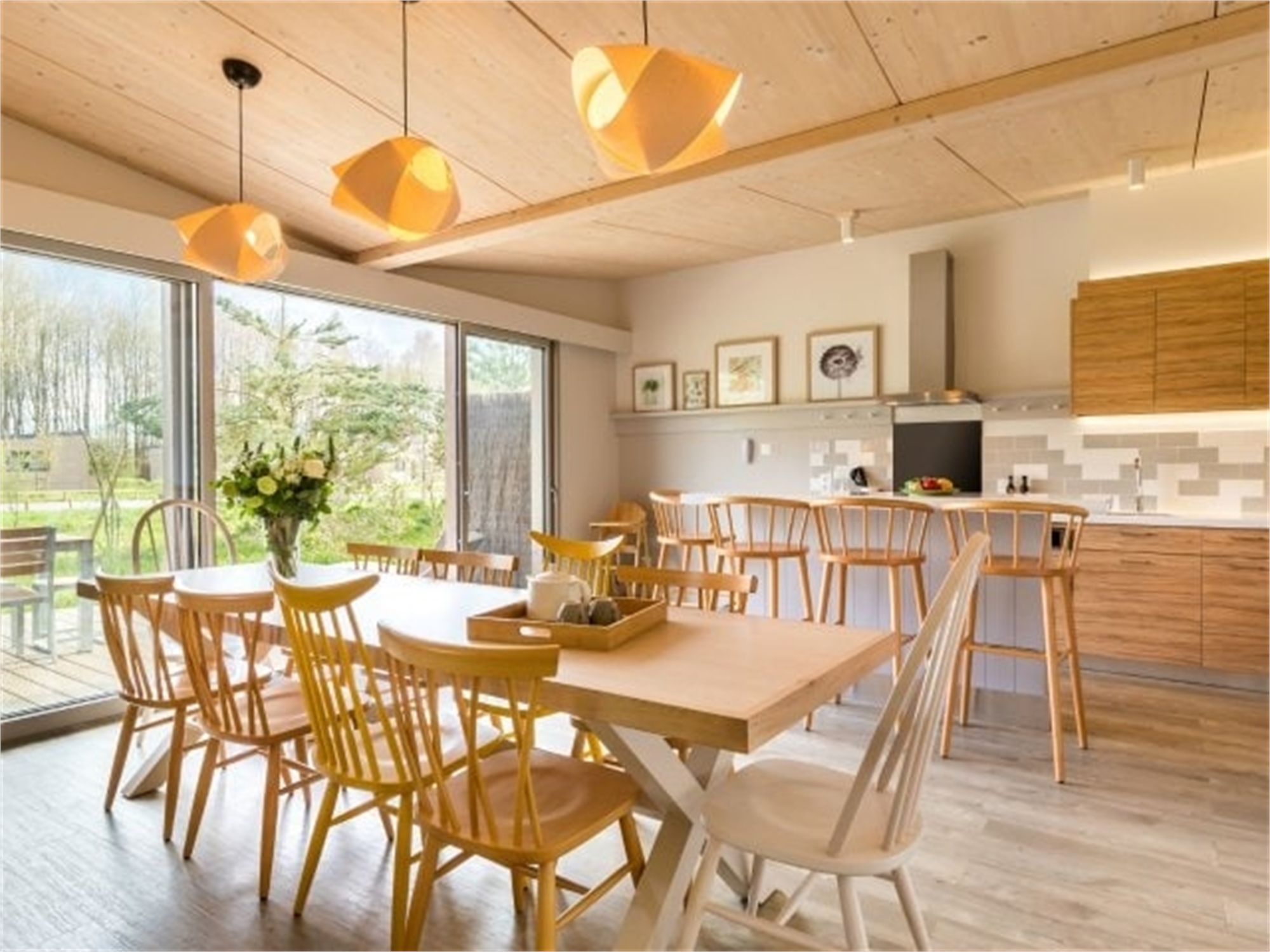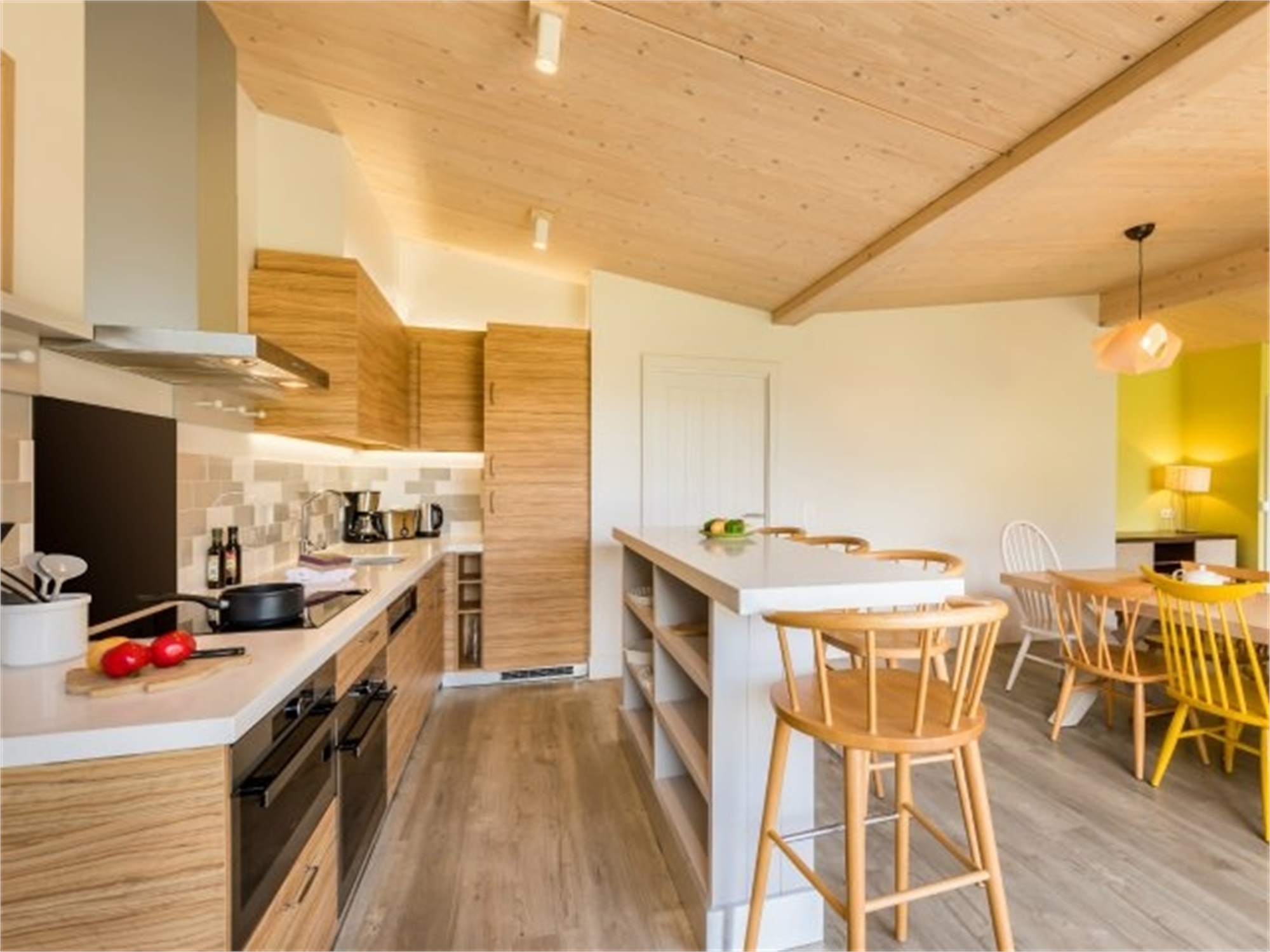 Fully equipped open-plan kitchen: crockery, dishwasher, cleaning kit, microwave grill, 4-ring induction hob, extractor hood, fridge, electric coffee maker, NESCAFÉ Dolce Gusto machine, kettle, toaster, waste-sorting bin.