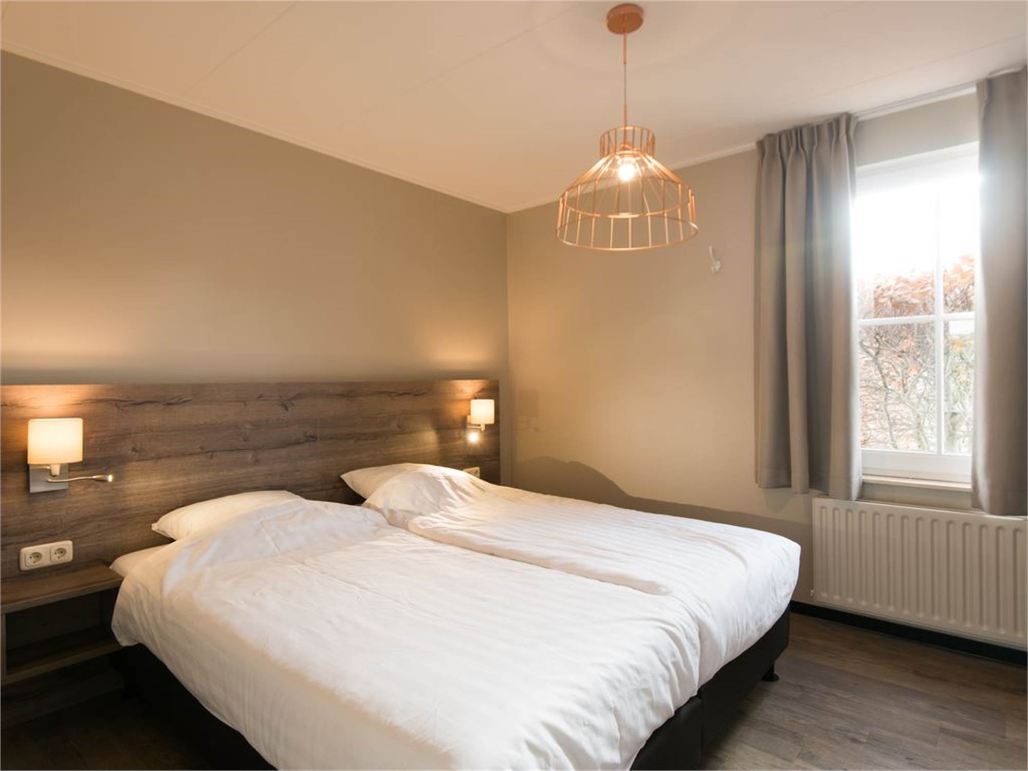 Bedroom with two single box spring beds, 2 person soft mattress topper and flatscreen TV