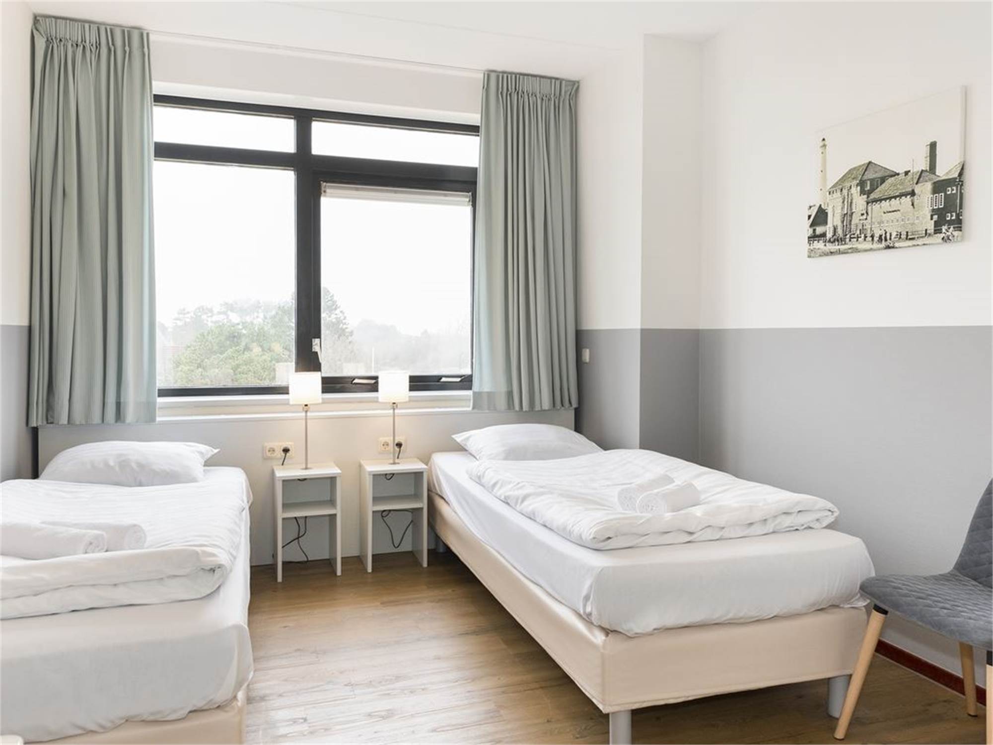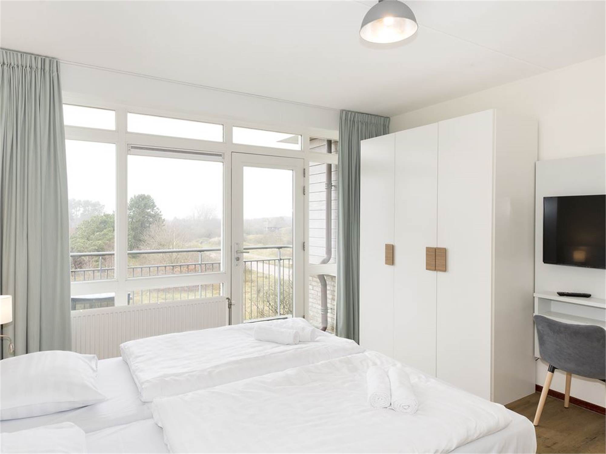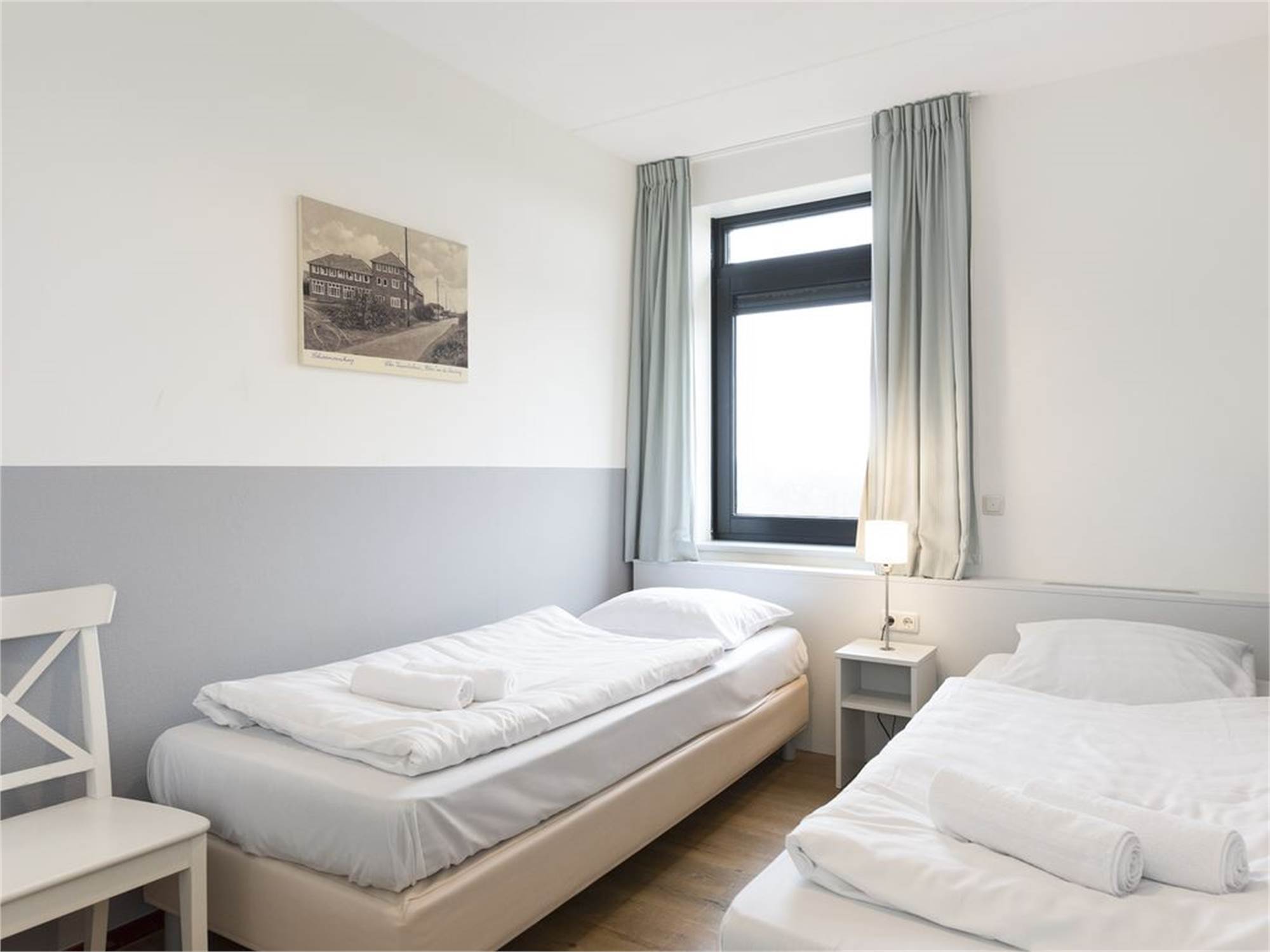 Bedroom with two single box spring beds, 2 person soft mattress topper and flatscreen TV