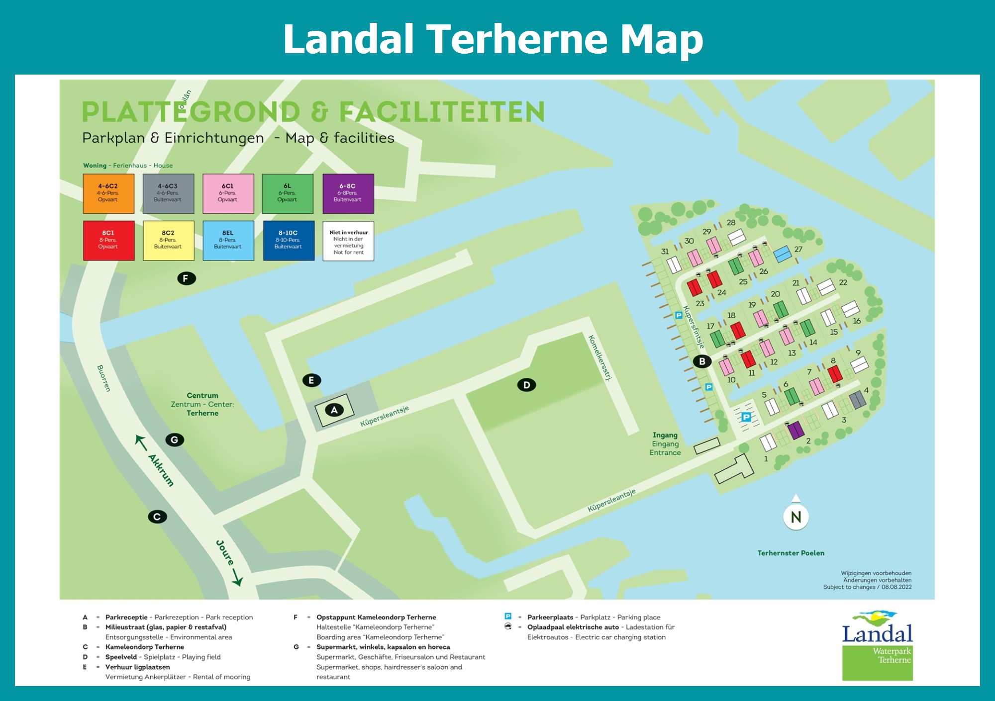 Up-to-date and comprehensive village map of Landal Terherne with all accommodations and facilities, also available as PDF.