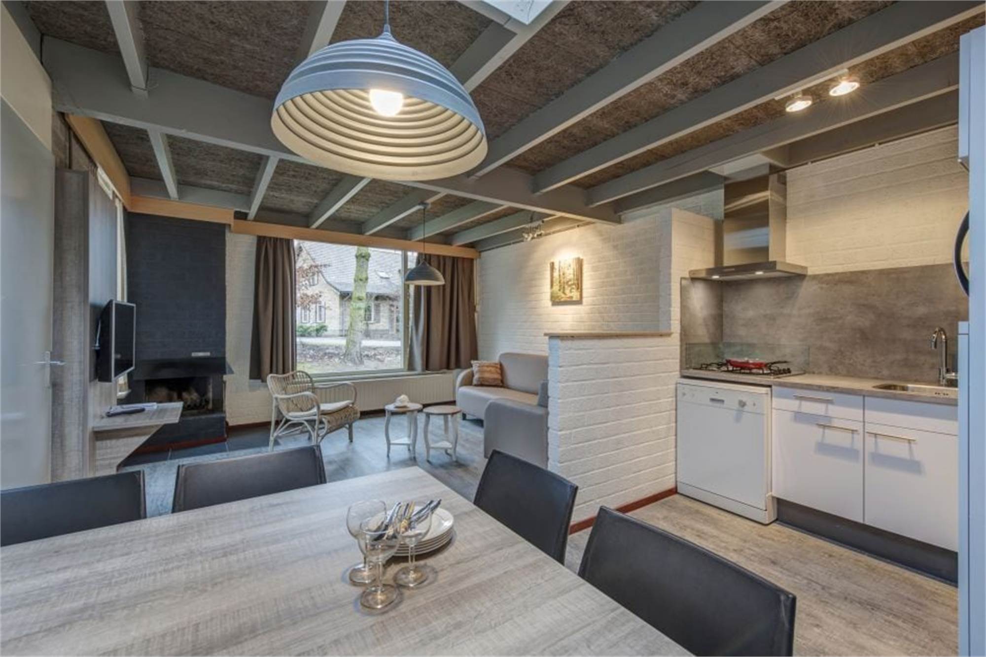 This one-level bungalow is fully restyled and suitable for 4 persons. The living room has a smart TV and open fireplace. The kitchen is equipped with a dishwasher, microwave oven, fridge/freezer and coffee machine. In addition, the bungalow has 2 bedrooms, each with 2 single beds, while one of the bedrooms has a television. There is a bathroom with rain-shower and a separate toilet. Furthermore the bungalow has an infrared sauna. Outside you will find a furnished terrace and use of Wi-Fi is free of charge.