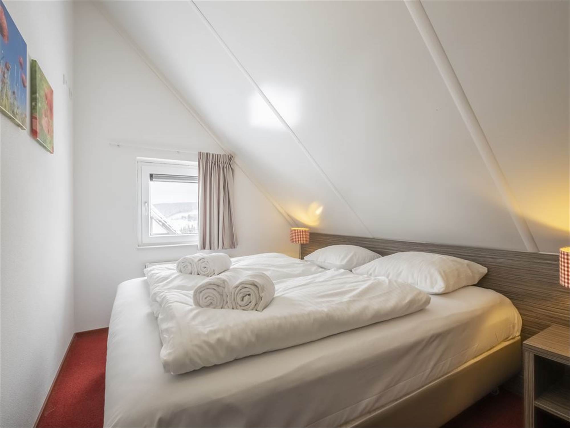 Bedroom with a 2-person box spring bed and flatscreen TV