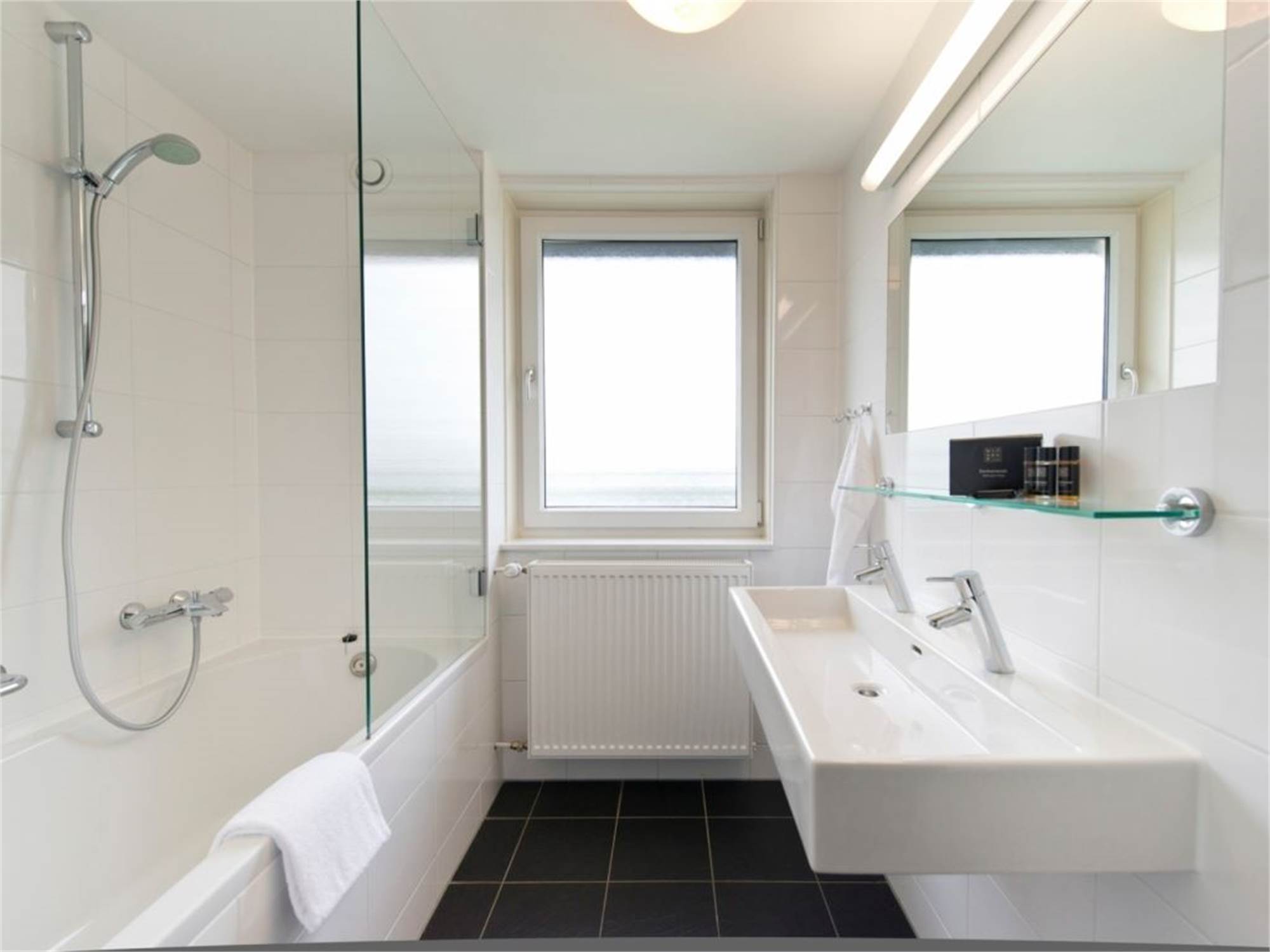 Bedroom with a 2-person box spring bed and soft mattress topper on the first floor