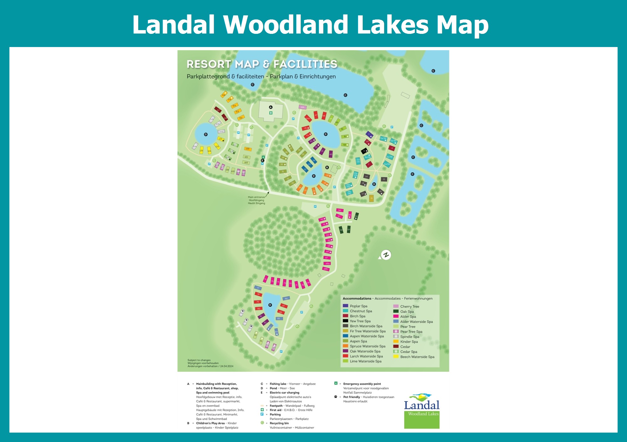Up-to-date and comprehensive village map of Landal Woodland Lakes with all accommodations and facilities, also available as PDF.