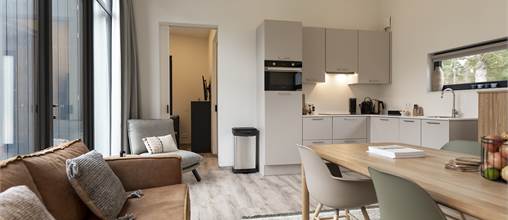 The living room is very comfortably furnished and has a beautiful light through the large, glass facade opening. Here you will find a cozy sitting area with flat screen TV and a dining table. The modern kitchen is very complete and equipped with an induction hob, dishwasher, Nespresso machine and combi microwave.